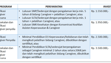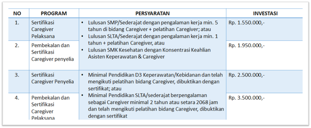 Caregiver Indonesia dengan bangga menghadirkan program sertifikasi resmi dari BNSP (Badan Nasional Sertifikasi Profesi) bagi tenaga pendamping lansia maupun calon caregiver profesional. Program ini dirancang untuk memastikan setiap caregiver memiliki standar kompetensi nasional yang diakui dan siap bersaing di dunia kerja, baik di dalam maupun luar negeri. Program sertifikasi ini terdiri dari Sertifikasi Caregiver Pelaksana, Sertifikasi Caregiver Penyelia, Pmbekalan Sertifikasi Caregiver Pelaksana, dan Pembekalan Sertifikasi Caregiver Penyelia. Detail pengenai 4 program ini dapat dilihat pada tabel dibawah ini :